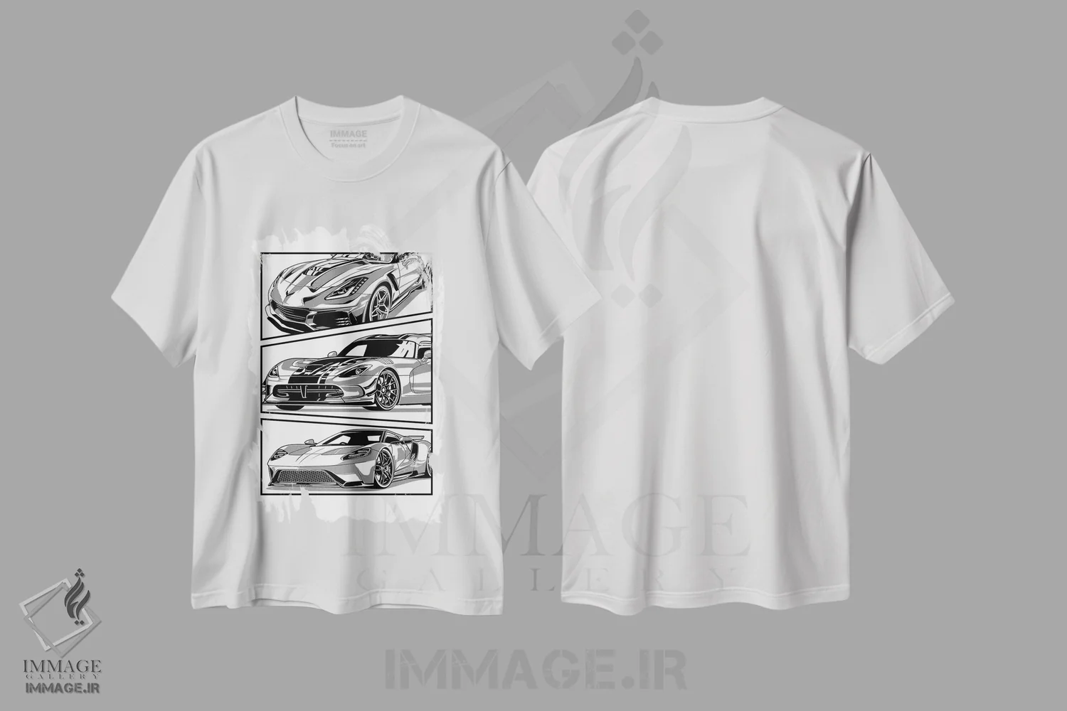 تیشرت سفید طرح دار ماشین های کلاسیک ۲۹، هنر دیجیتال سیاه و سفید اثر گب فرناندو | فروشگاه ایماژ