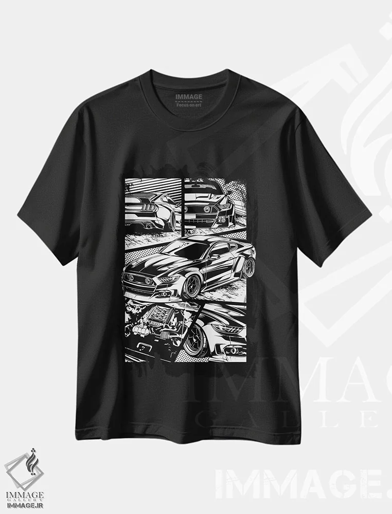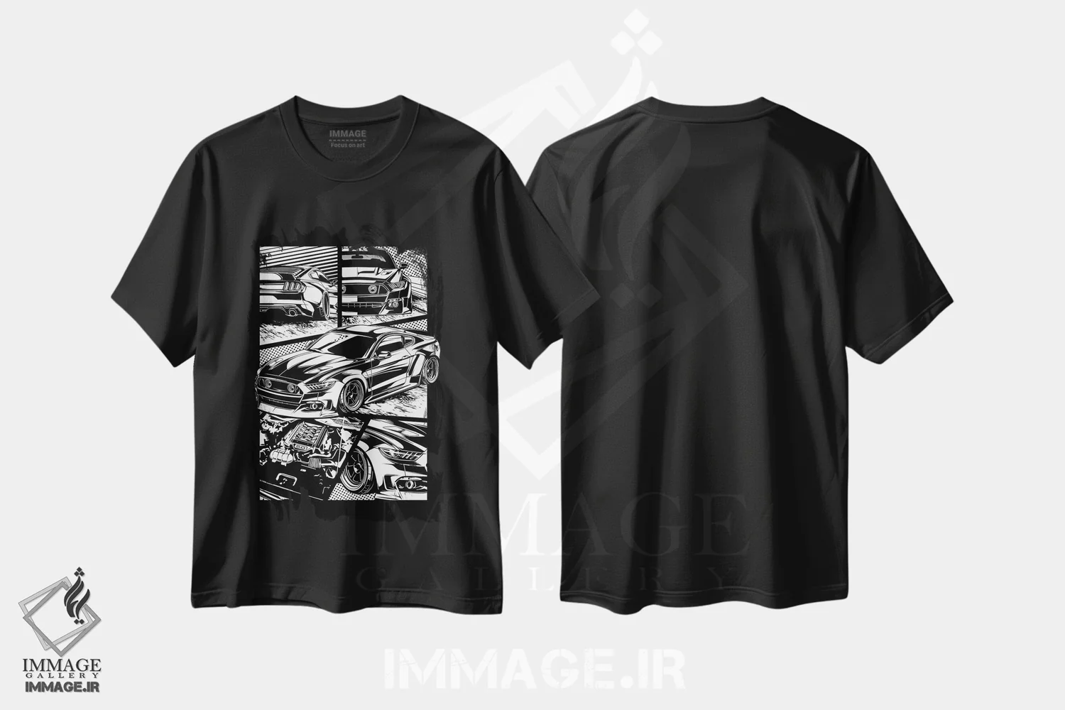 تیشرت مشکی طرح دار ماشین های کلاسیک ۶۰، هنر دیجیتال سیاه و سفید اثر گب فرناندو | immage.ir