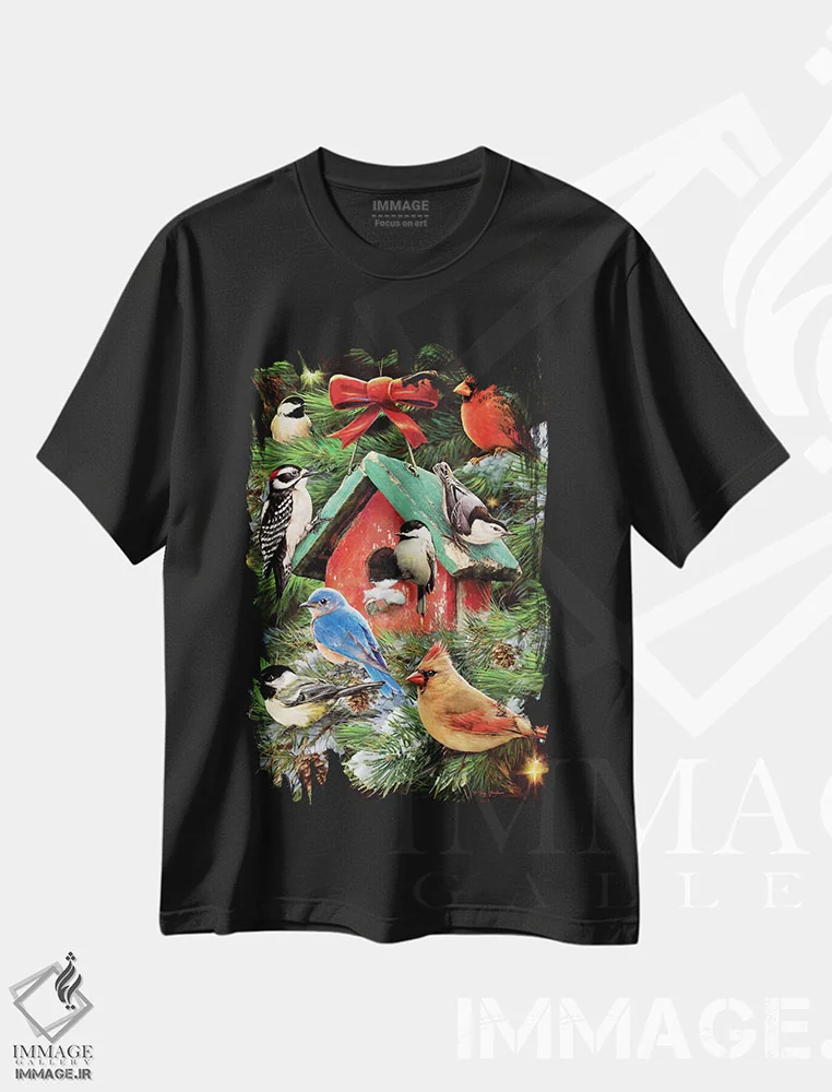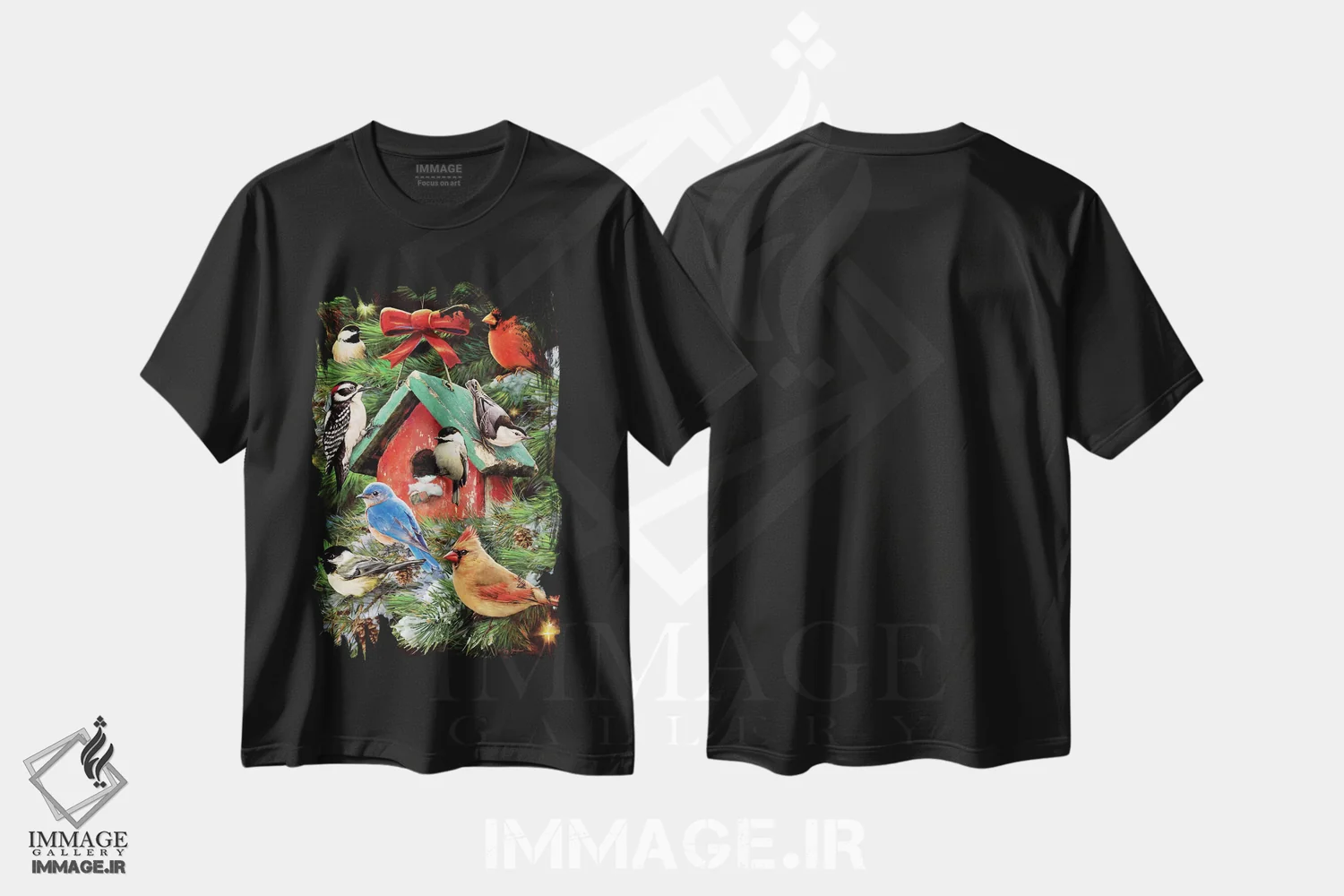 تیشرت مشکی طرح دار خانه پرندهٔ کریسمس و کاج ها، تزئینی اثر گرگ جوردانو | immage.ir
