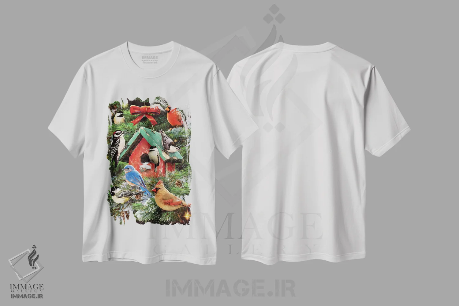 تیشرت سفید طرح دار خانه پرندهٔ کریسمس و کاج ها، تزئینی اثر گرگ جوردانو | فروشگاه ایماژ
