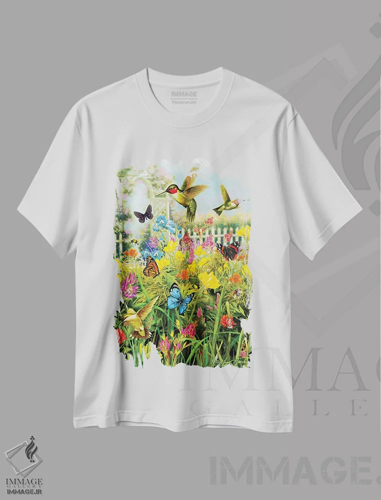 تیشرت سفید طرح دار مرغ مگس خوار و آلاچیق، تزئینی اثر گرگ جوردانو | immage.ir