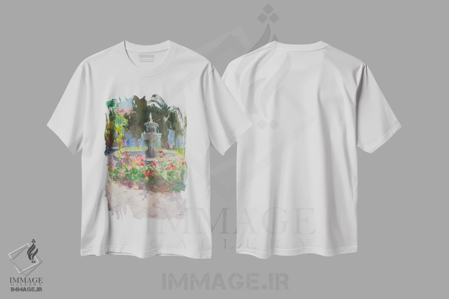 تیشرت سفید طرح دار فواره ایتالیایی، هنر فاخر معاصر اثر کنتس آرت | فروشگاه ایماژ