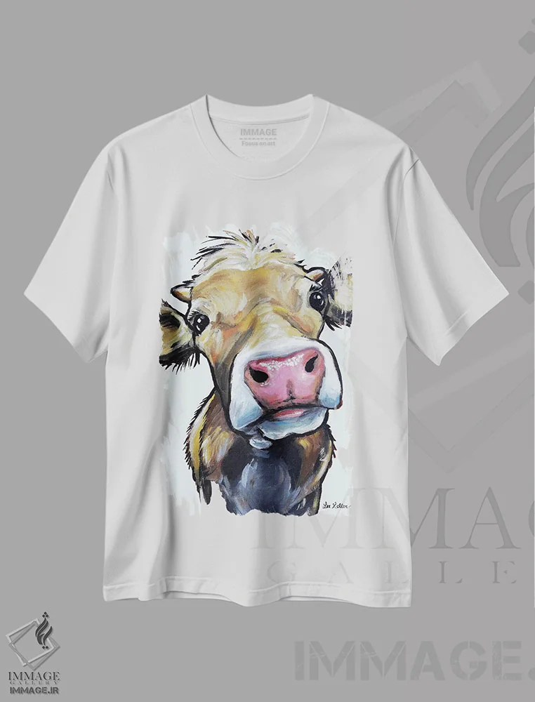 تیشرت سفید طرح دار گاو هیزل روی زمینه خاکستری، مدیوم اثر هیپی هاوند استودیوز | immage.ir