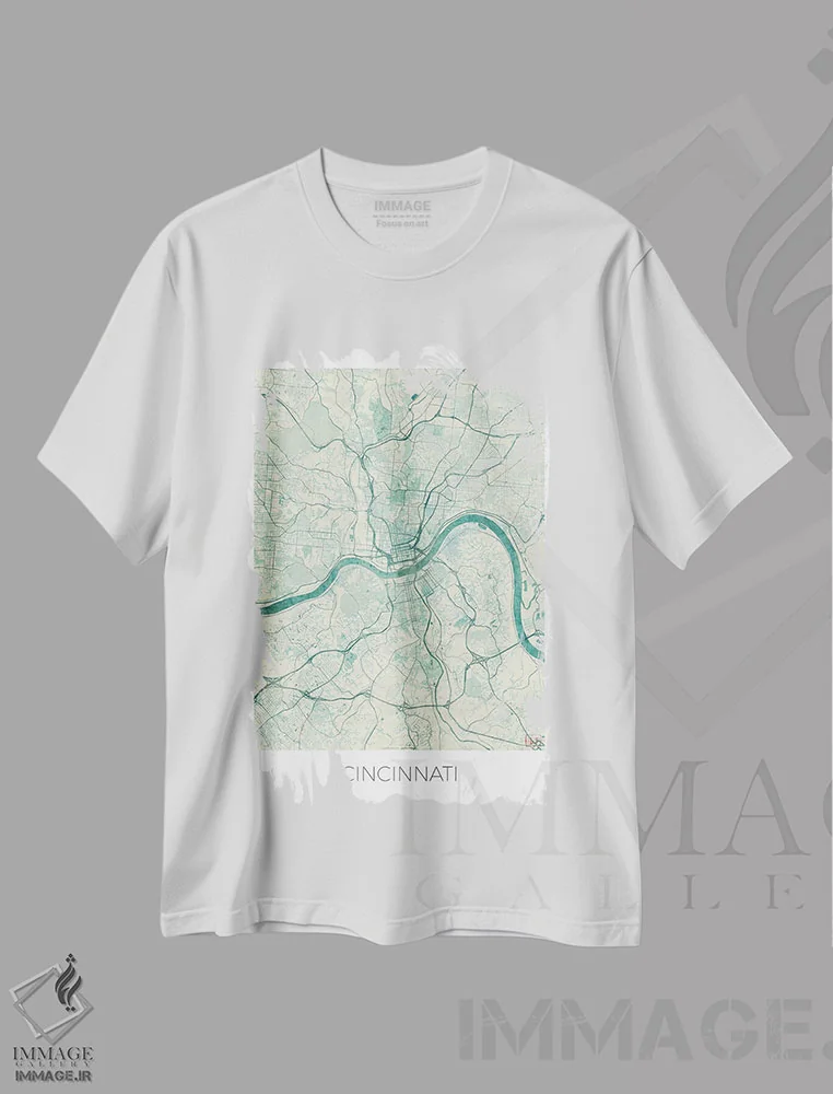 تیشرت سفید طرح دار نقشه طرح شهری آبرنگی آبی قدیمی سینسیناتی، هنر دیجیتال اثر هوبرت روگوسکی | immage.ir