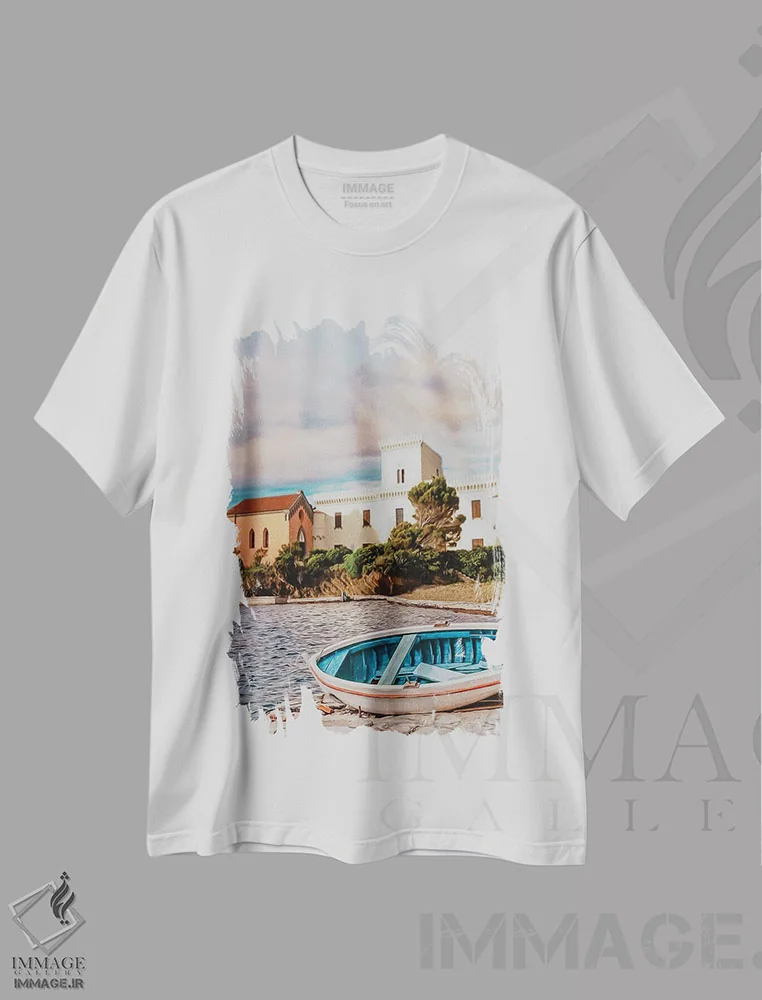 تی شرت «قایق چوبی کنار شهر قدیمی»؛ وینتیج دریایی برای استایل آرام
