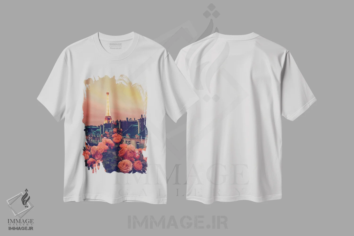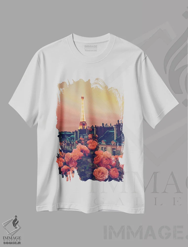 تیشرت طرح دار گل های بالکن بر پس زمینه پاریس در غروب اثر ایوجنیا بیدیوک