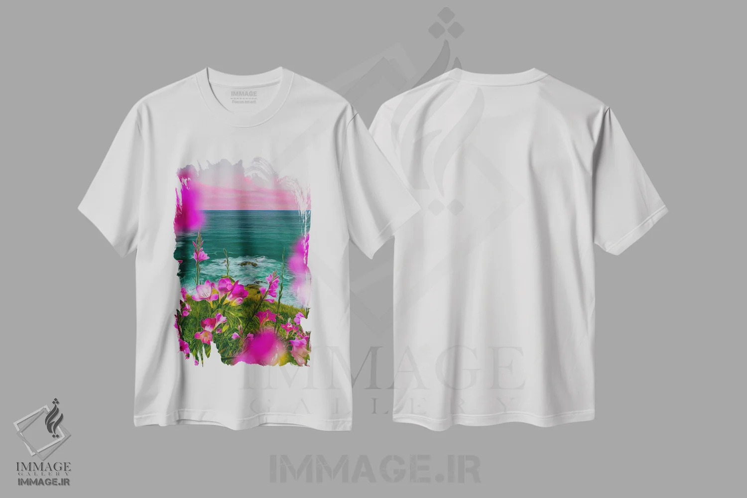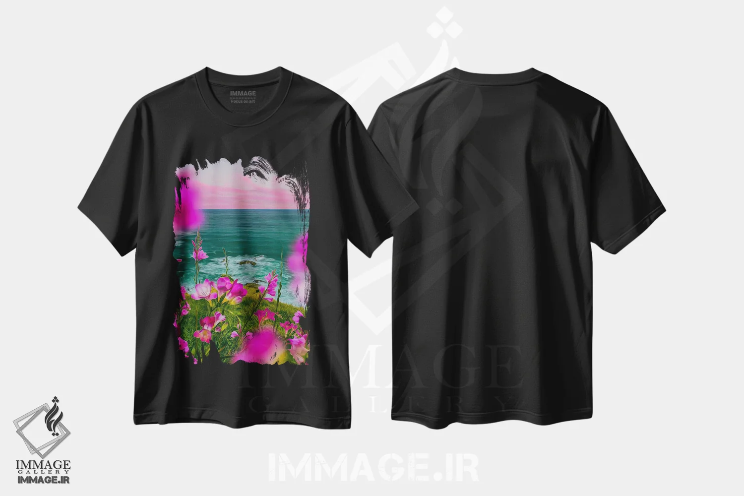 تیشرت طرح دار فریزیا صورتی شکوفا بر تپه ای در کنار دریا اثر ایوجنیا بیدیوک