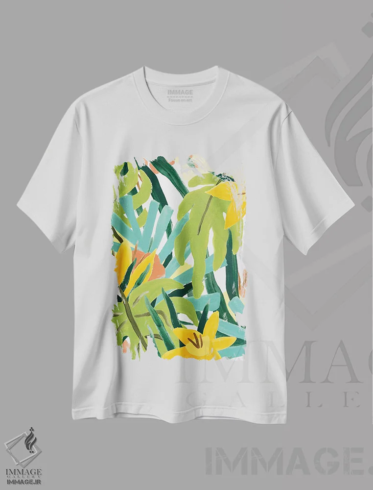 تیشرت سفید طرح دار سقف پوشیده از برگ نخل ۱، تزئینی اثر جون اریکا وس | immage.ir