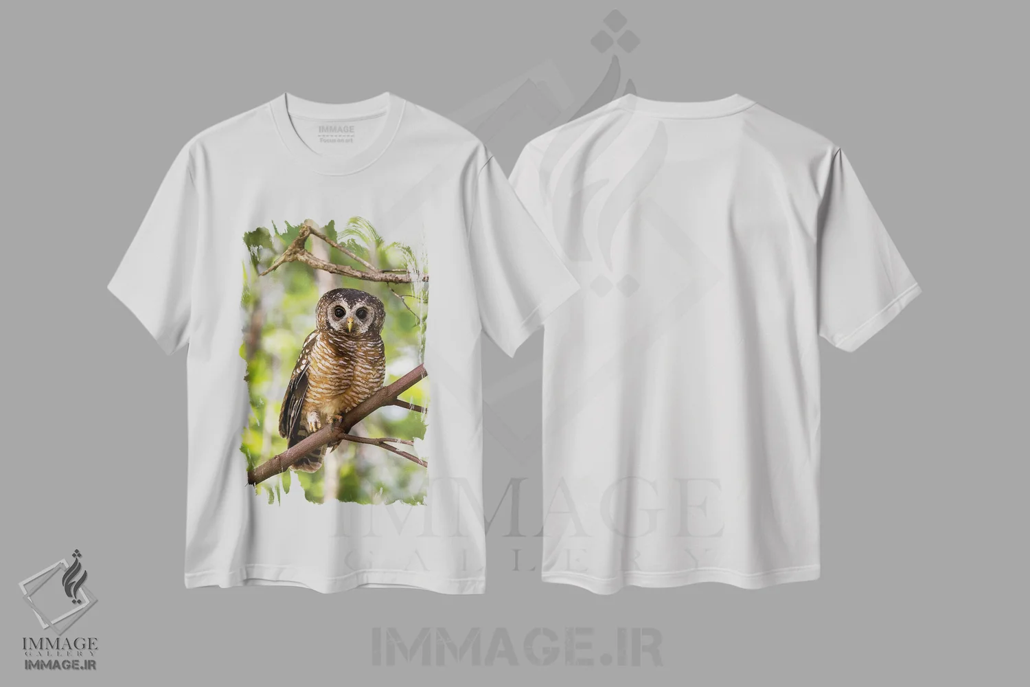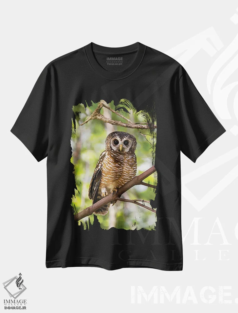 نمای نزدیک جغد جنگلی آفریقایی؛ تی شرت با تمرکز بر جزئیات