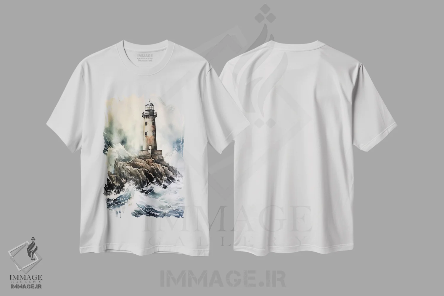 تیشرت سفید طرح دار فانوس دریایی در دریای طوفانی، مدیوم اثر جین ریکس | فروشگاه ایماژ