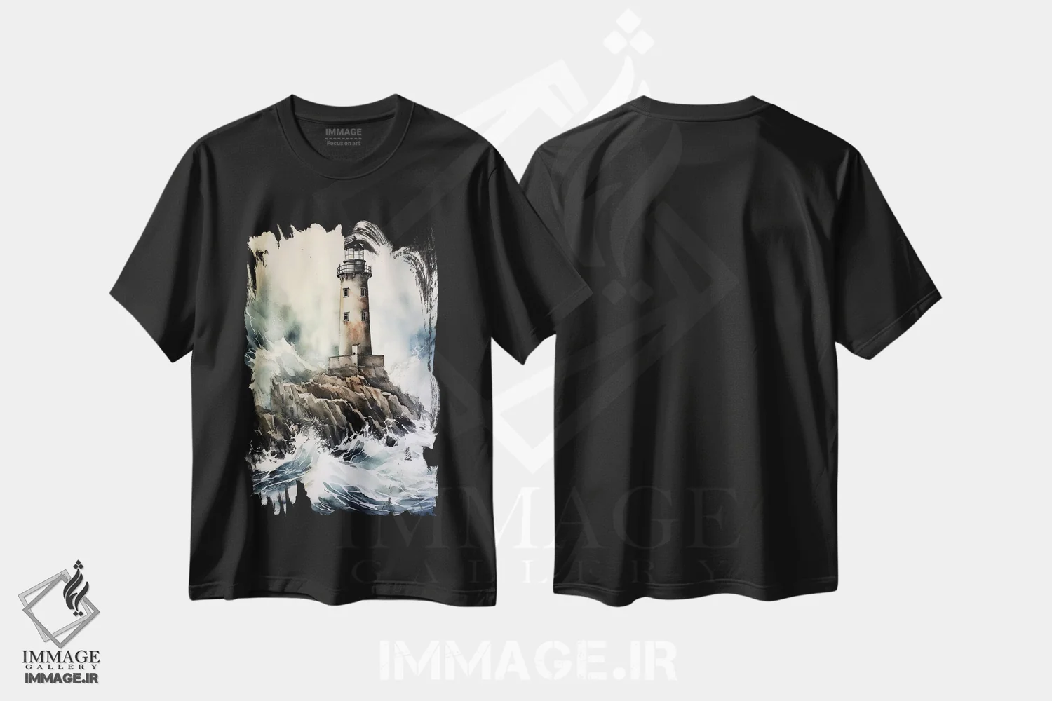 تیشرت مشکی طرح دار فانوس دریایی در دریای طوفانی، مدیوم اثر جین ریکس | immage.ir