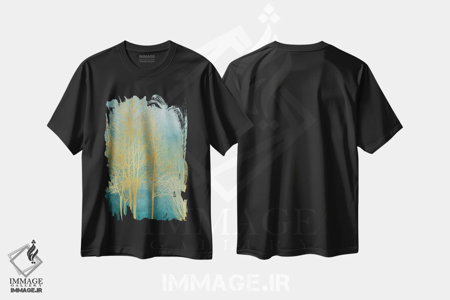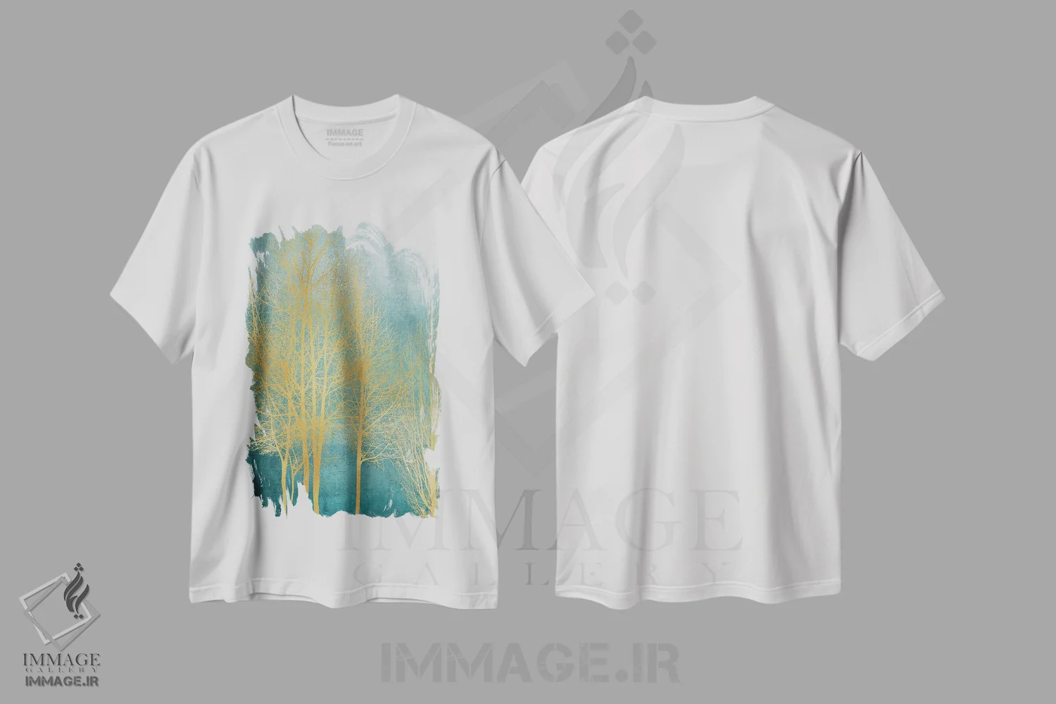 تی شرت «درختان طلایی روی زمینه آبی فیروزه ای I»؛ تضاد رنگی چشمگیر