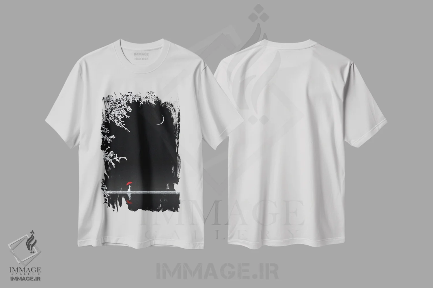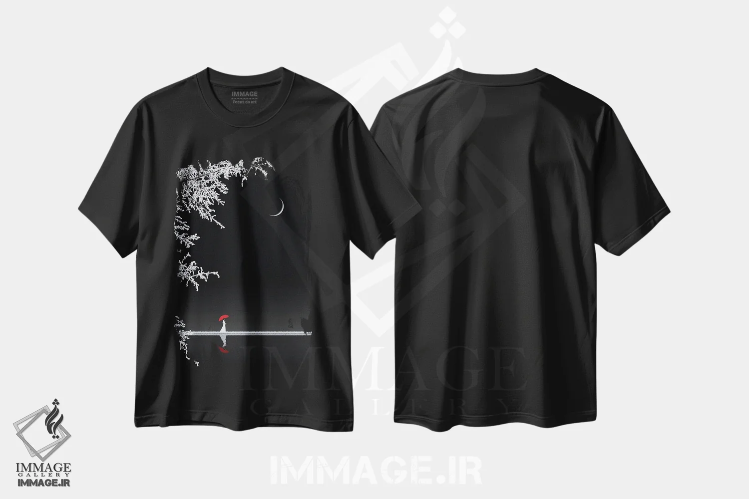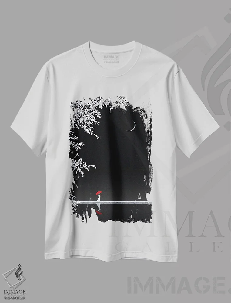 تیشرت مشکی طرح دار بانویی با چتر قرمز، عکاسی ترکیبی اثر کاترین فدرر | فروشگاه ایماژ