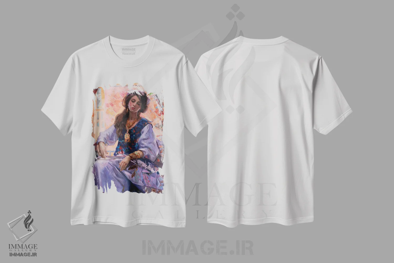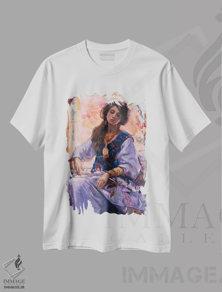تیشرت سفید طرح دار دختر شرقی، هنر فاخر معاصر اثر خانلار اسدالله یف | immage.ir