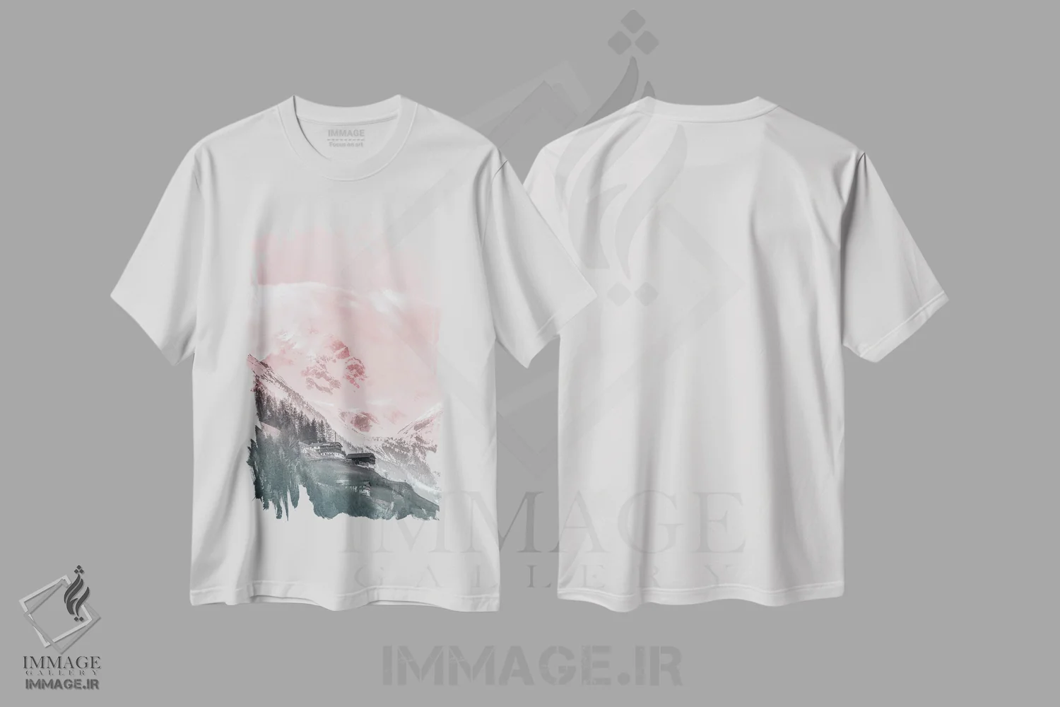 تیشرت سفید طرح دار چشم انداز کوهستانی صورتی، مدیوم اثر کارن منداو | فروشگاه ایماژ