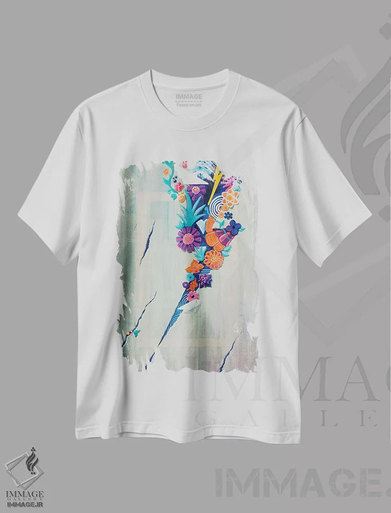 تیشرت سفید طرح دار شکوفایی، آبستره اثر کولورمور | immage.ir