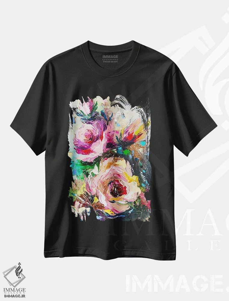 تیشرت مشکی طرح دار سمفونی شکوفه های رز، آبستره اثر کوپتسووا آرت | فروشگاه ایماژ