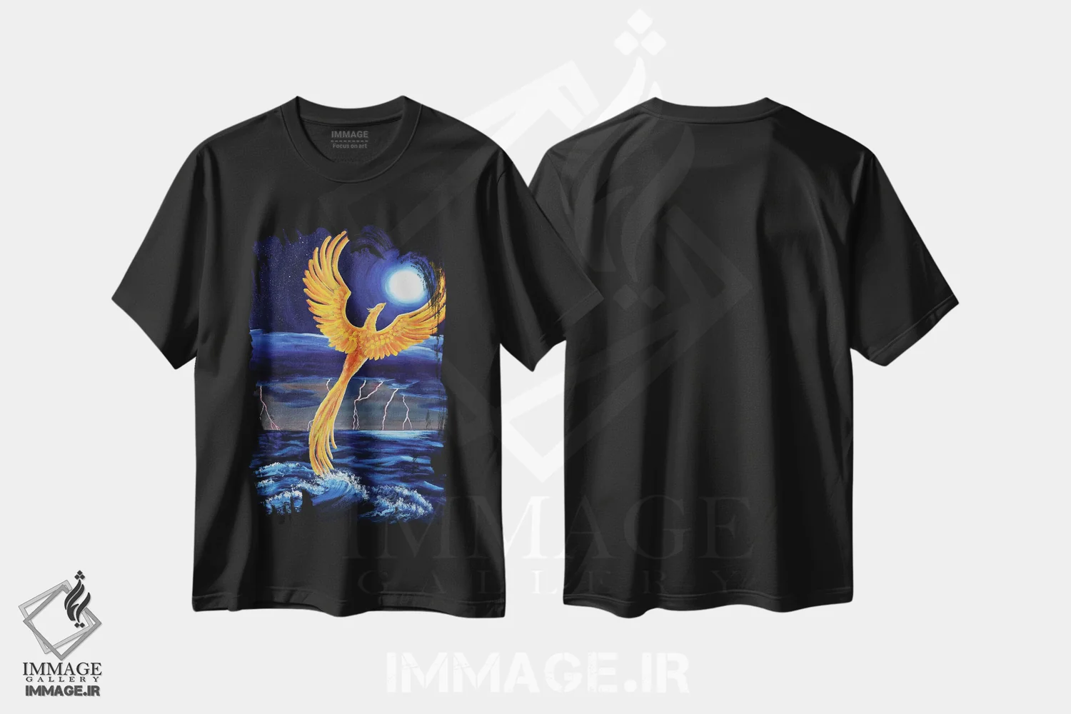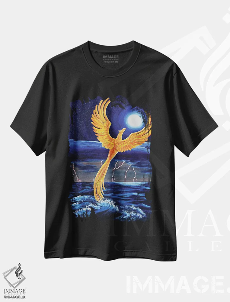 تیشرت مشکی طرح دار ققنوس برخاسته از دریا، هنر فاخر معاصر اثر لورا ایورسن | immage.ir