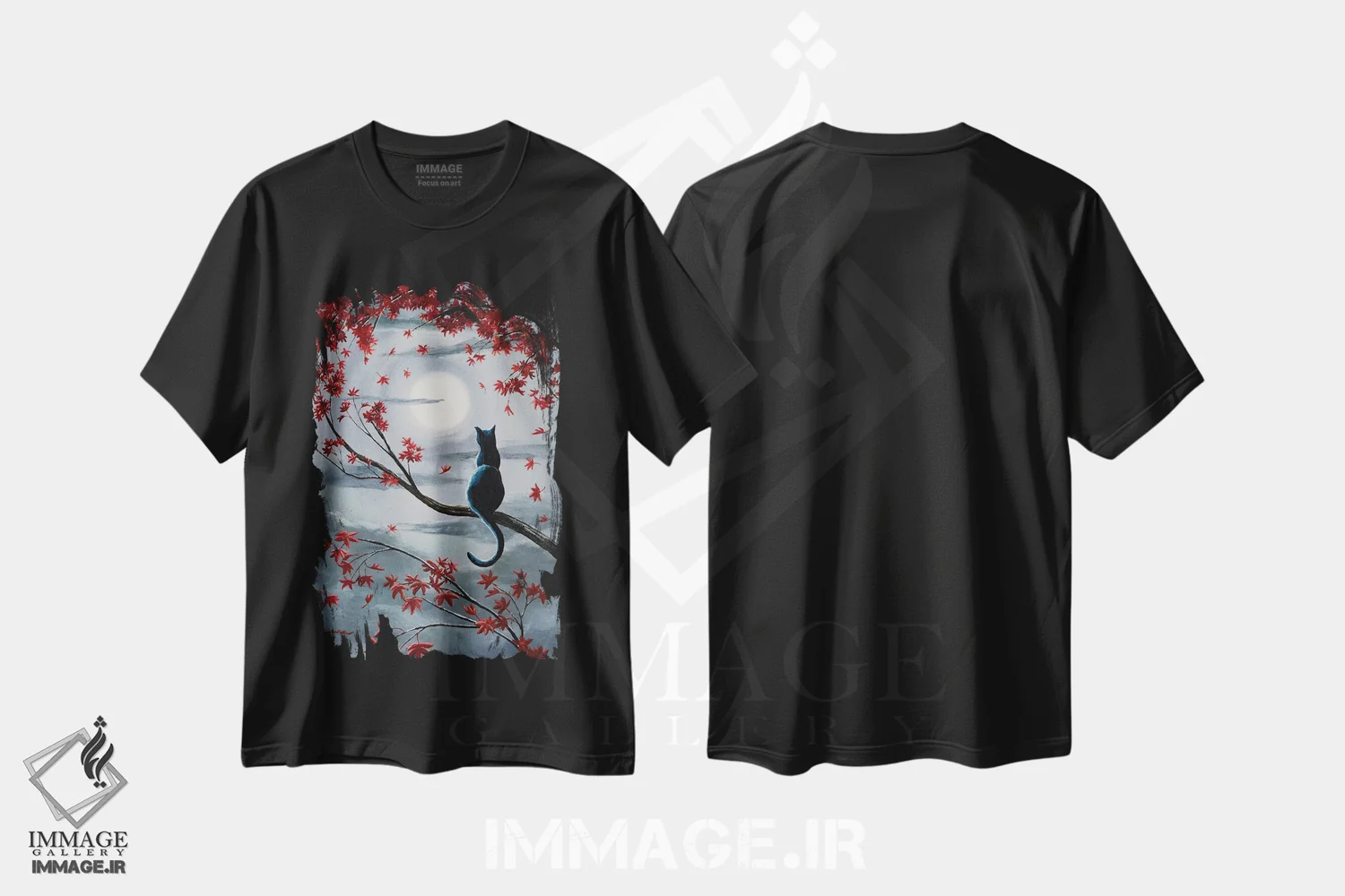 تیشرت مشکی طرح دار گربه سیاه در نور ماه نقره ای، هنر فاخر معاصر اثر لورا ایورسن | فروشگاه ایماژ