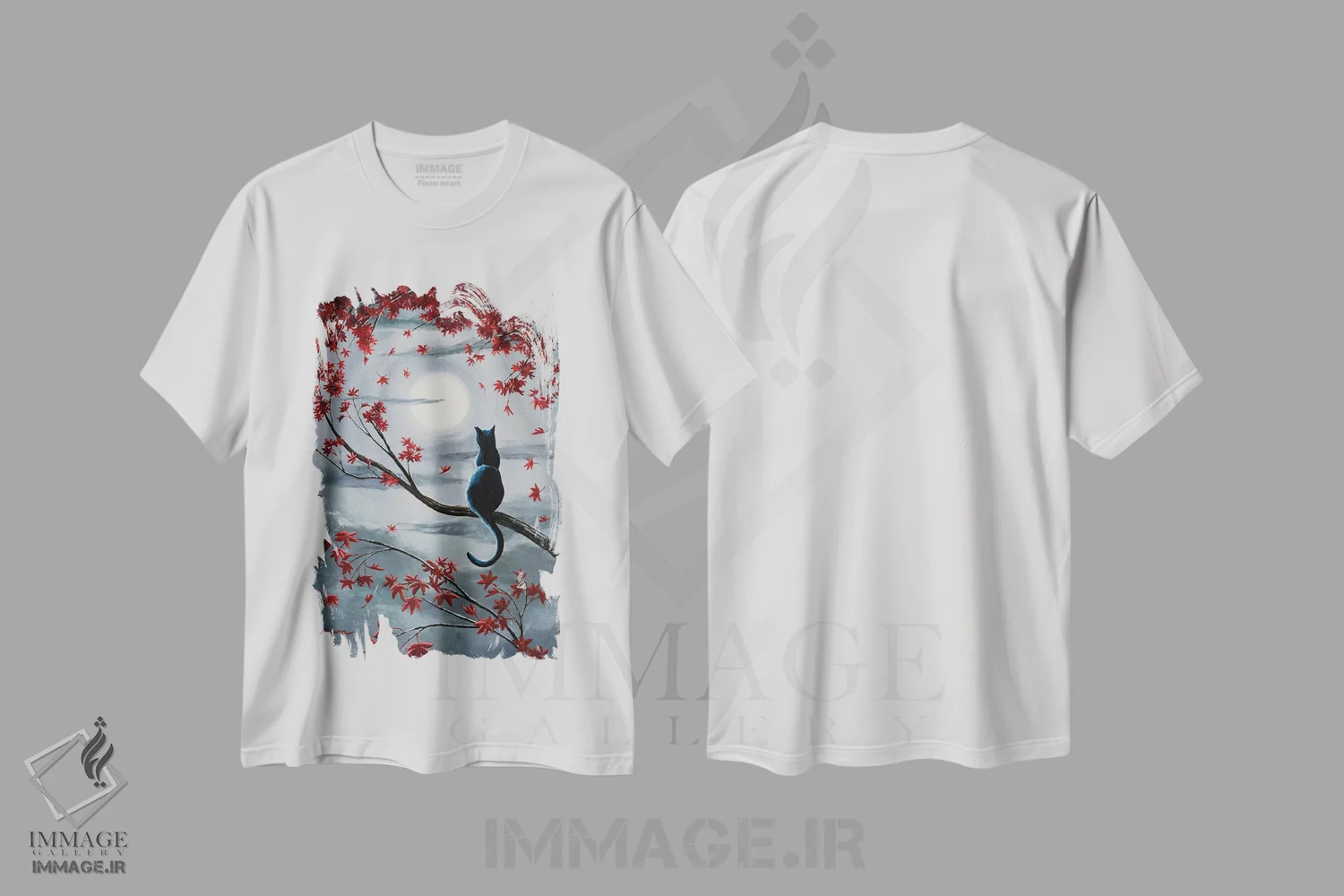 تیشرت سفید طرح دار گربه سیاه در نور ماه نقره ای، هنر فاخر معاصر اثر لورا ایورسن | immage.ir