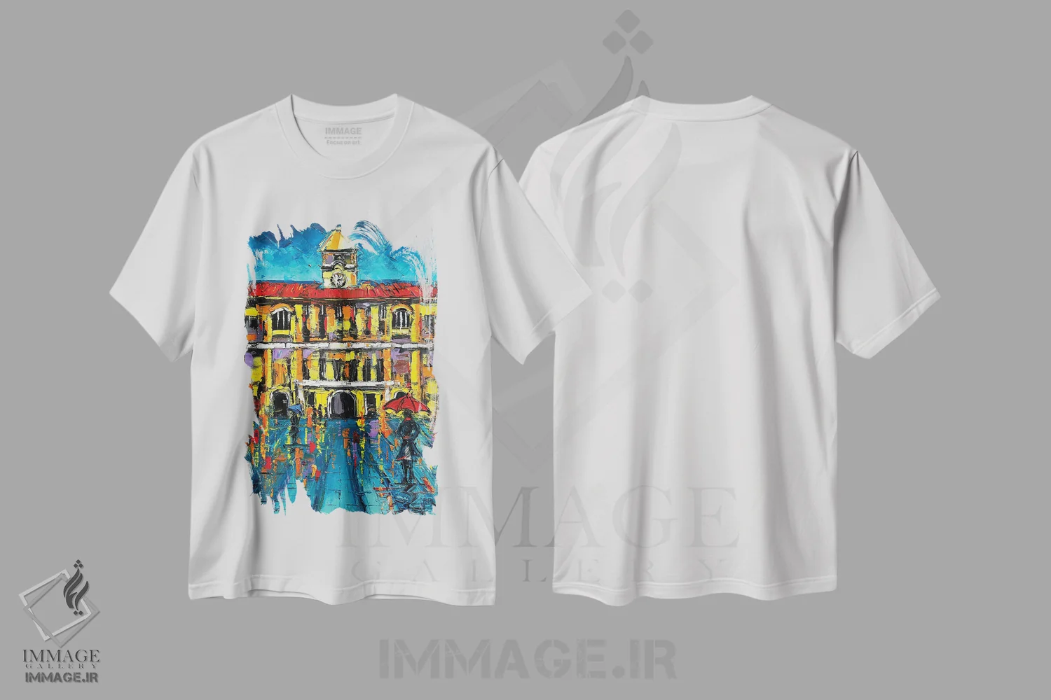 تیشرت سفید طرح دار ساختمان اسکلهٔ سان فرانسیسکو، هنر فاخر معاصر اثر لیزا الی | فروشگاه ایماژ