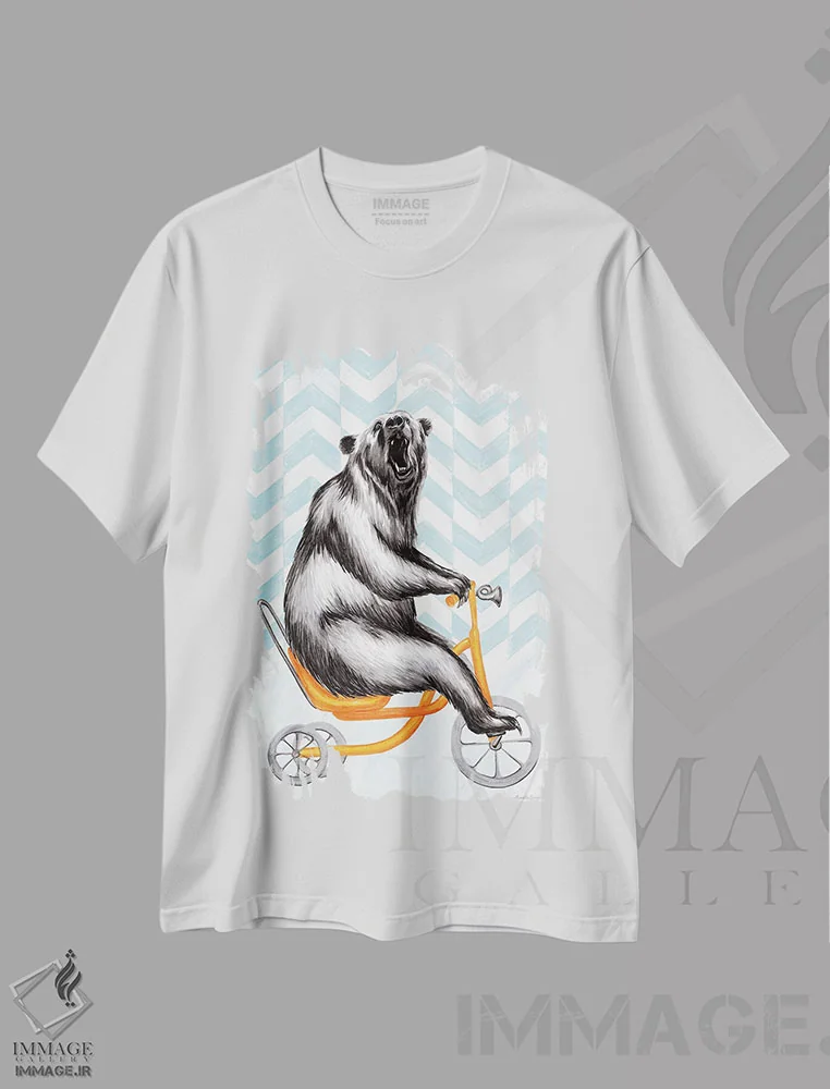 تیشرت سفید طرح دار خرس روی دوچرخه، تزئینی اثر آملی لگو | immage.ir