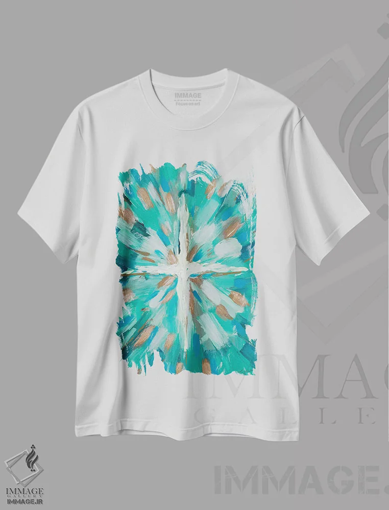 تیشرت سفید طرح دار شکوهِ فیروزه ای اثر ال. هیویت | immage.ir