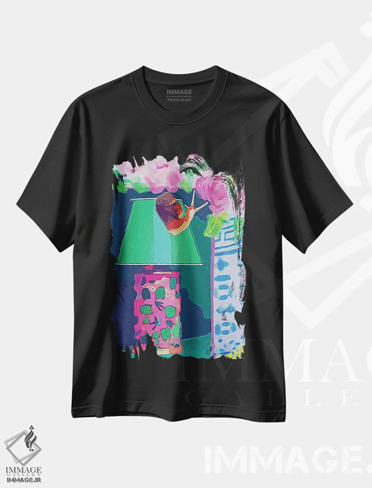 تیشرت طرح دار حلزون روی زمینه صورتی و سبز اثر لوسی کلیمنکو