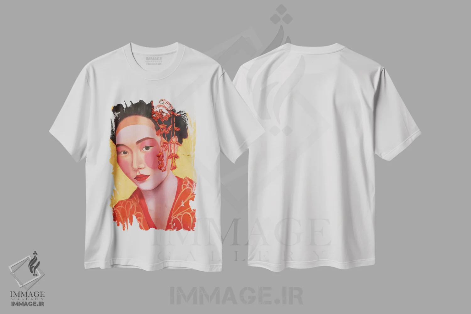 تیشرت طرح دار گیشا در کیمونو روی زمینه طلایی شماره اثر جین لانتسمن