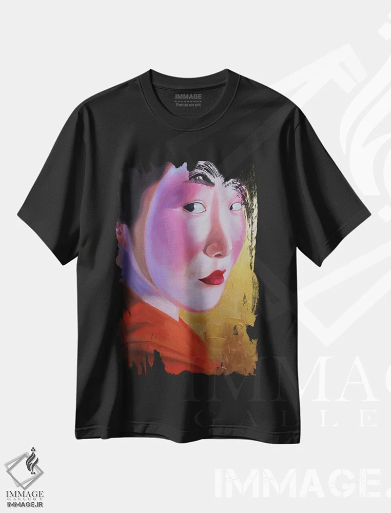 تی شرت هنری «گیشا در کیمونو روی زمینه طلایی شماره ۳»؛ تلفیق زیبایی آسیایی و مد شهری