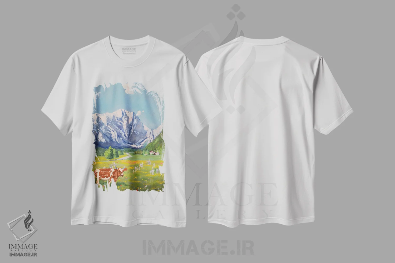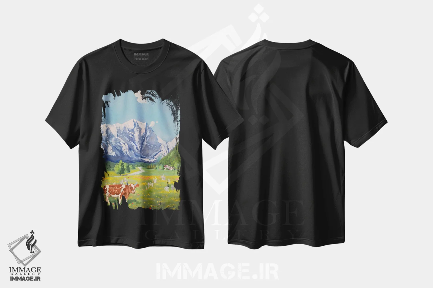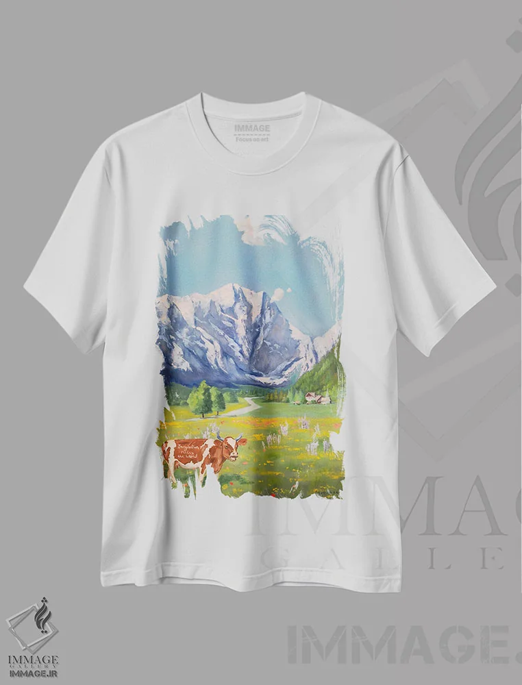 تی شرت «گاو در منظره کوه های سوئیس»؛ هنر طبیعت نگار برای استایل روستایی مدرن
