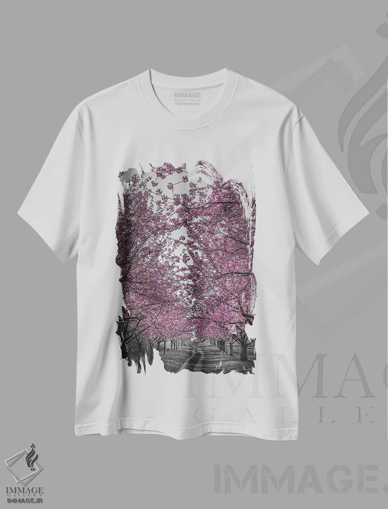تیشرت سفید طرح دار – تیشرت طبیعت ,کوچه شگفت انگیز شکوفه های گیلاس صورتی اثر ملانی ویولا immage.ir