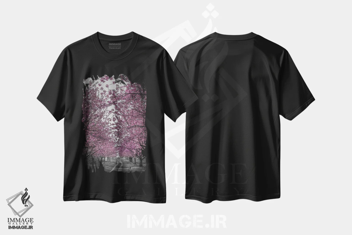 تیشرت مشکی طرح دار – تیشرت طبیعت ,کوچه شگفت انگیز شکوفه های گیلاس صورتی اثر ملانی ویولا فروشگاه ایماژ