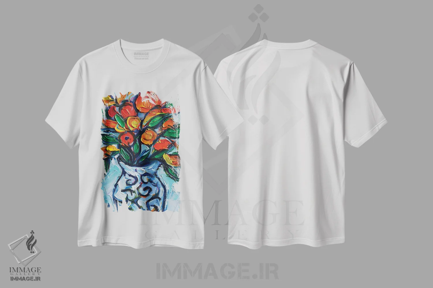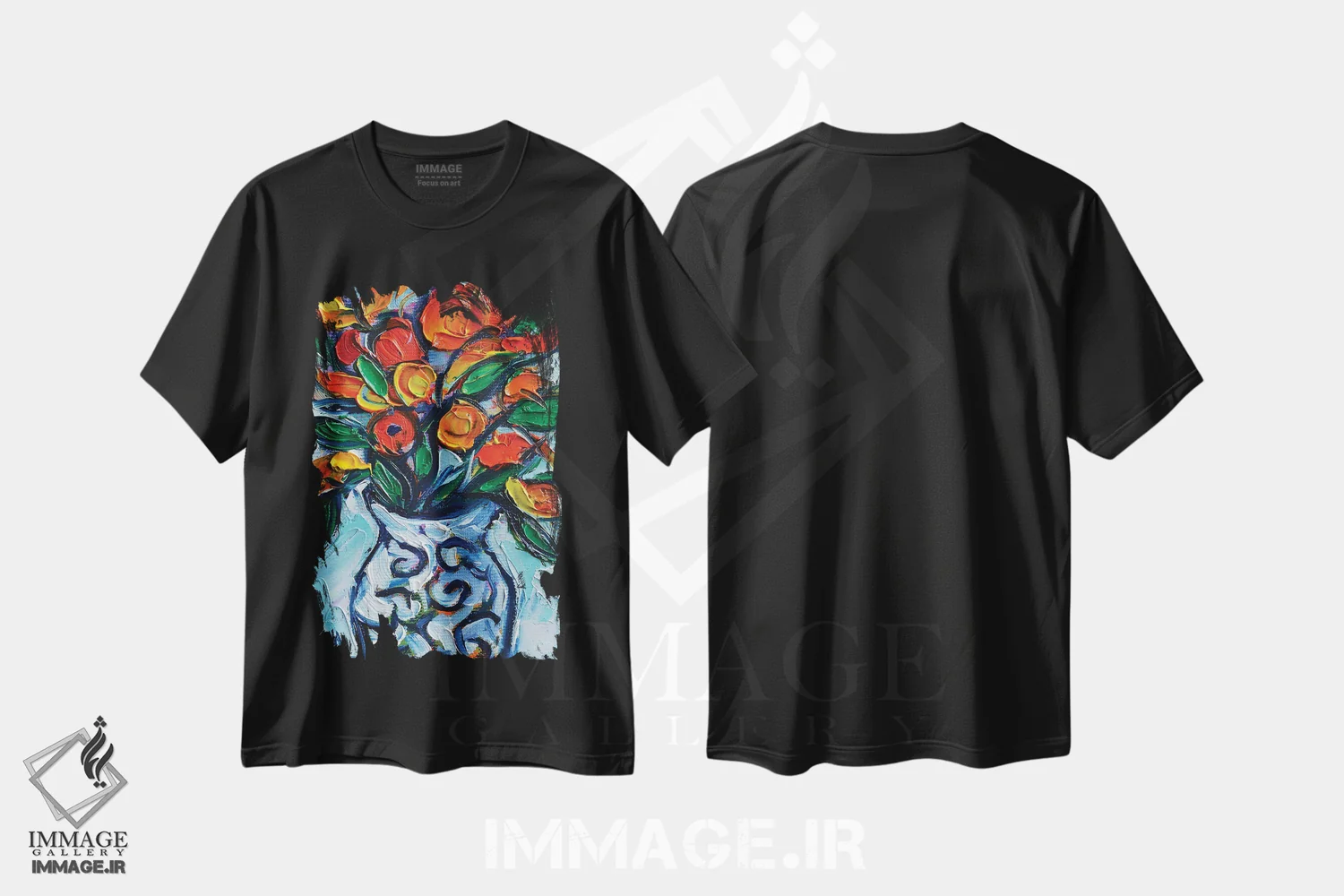 طرح «گل های نارنجی در گلدان سفید»؛ رنگ و لطافت روی تی شرت