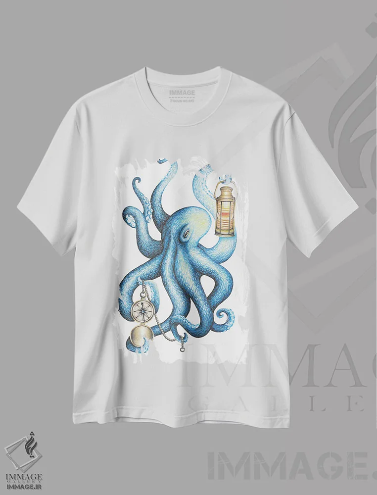 تیشرت سفید طرح دار – تیشرت دریایی ,اختاپوس اثر مندی هک immage.ir