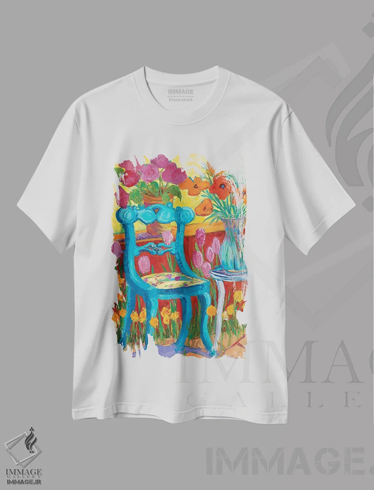تیشرت سفید طرح دار – تیشرت هنری ,صندلی باغ آبی اثر میشل کریسمن immage.ir