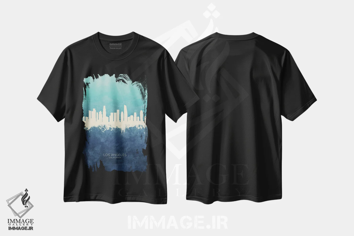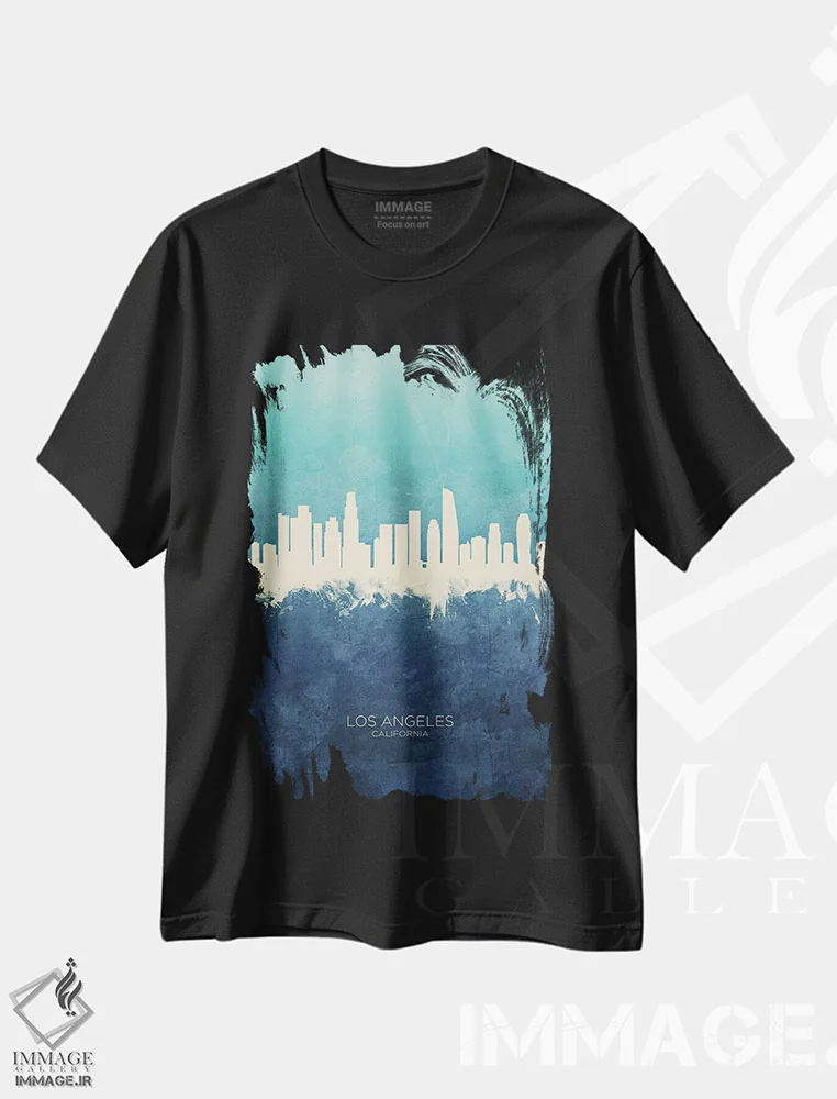 تیشرت طرح سفر ,نمای افق لس آنجلس، کالیفرنیا با رنگ سرمه ای و فیروزه ای اثر مایکل تامپست