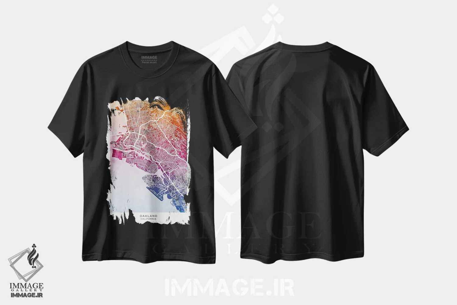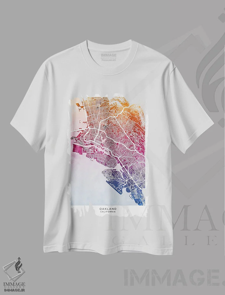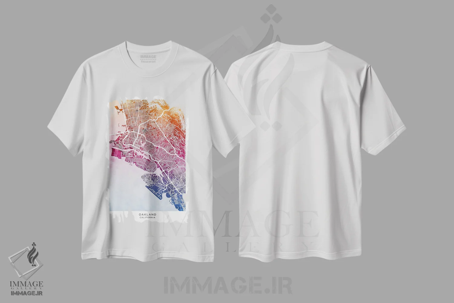 اوکلند در رنگ نمای مدرن؛ تی شرت مینیمال با طرح نقشه آبی-صورتی
