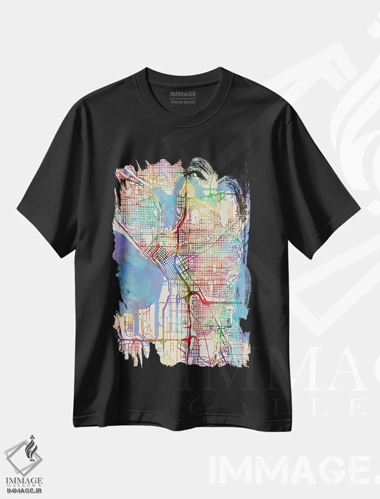 تیشرت مشکی طرح دار – تیشرت گرافیکی ,Washington, USA,نقشه رنگین کمانی سیاتل، واشینگتن، آمریکا اثر مایکل تامپست immage.ir