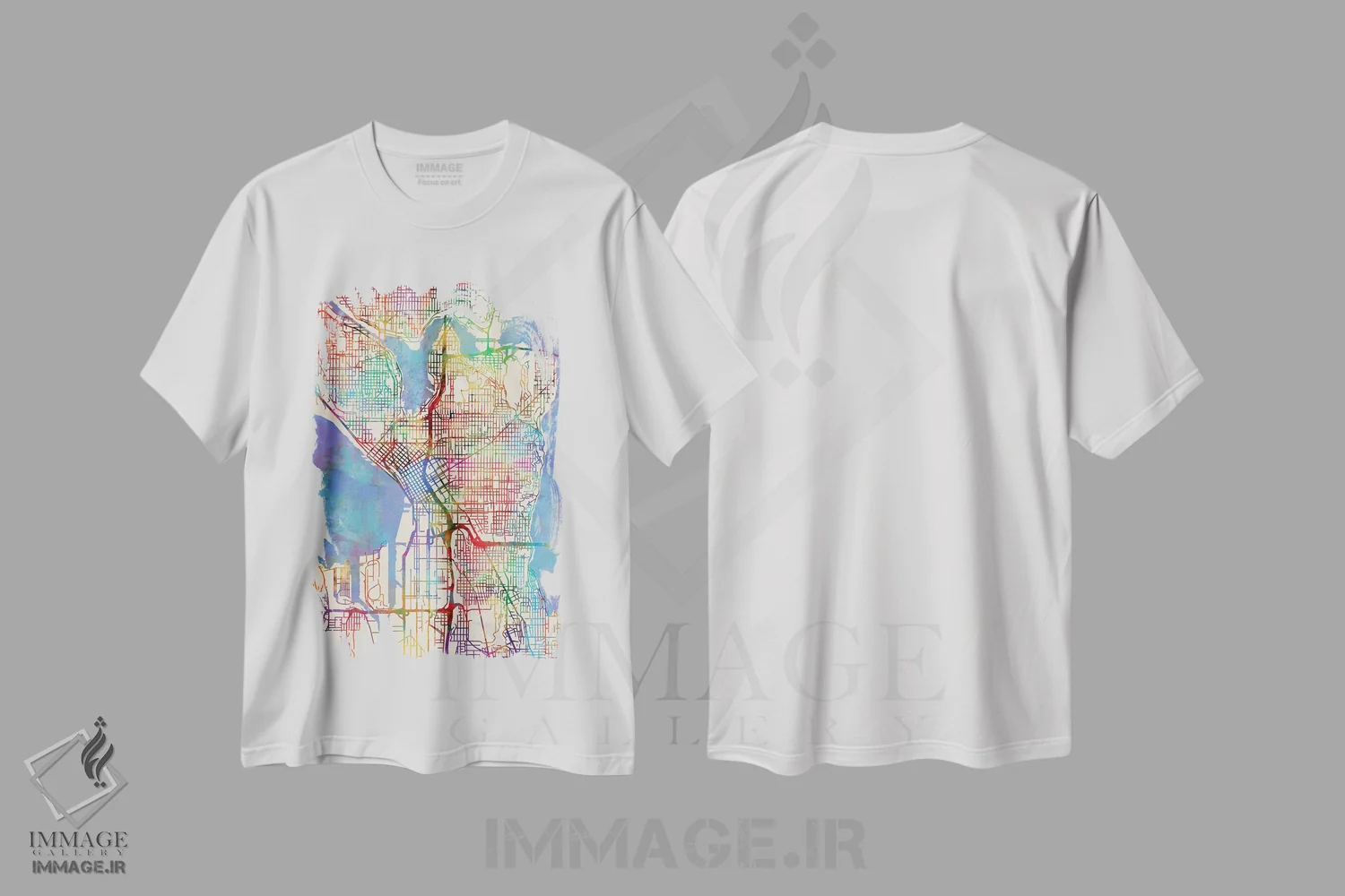 تیشرت سفید طرح دار – تیشرت گرافیکی ,Washington, USA,نقشه رنگین کمانی سیاتل، واشینگتن، آمریکا اثر مایکل تامپست فروشگاه ایماژ