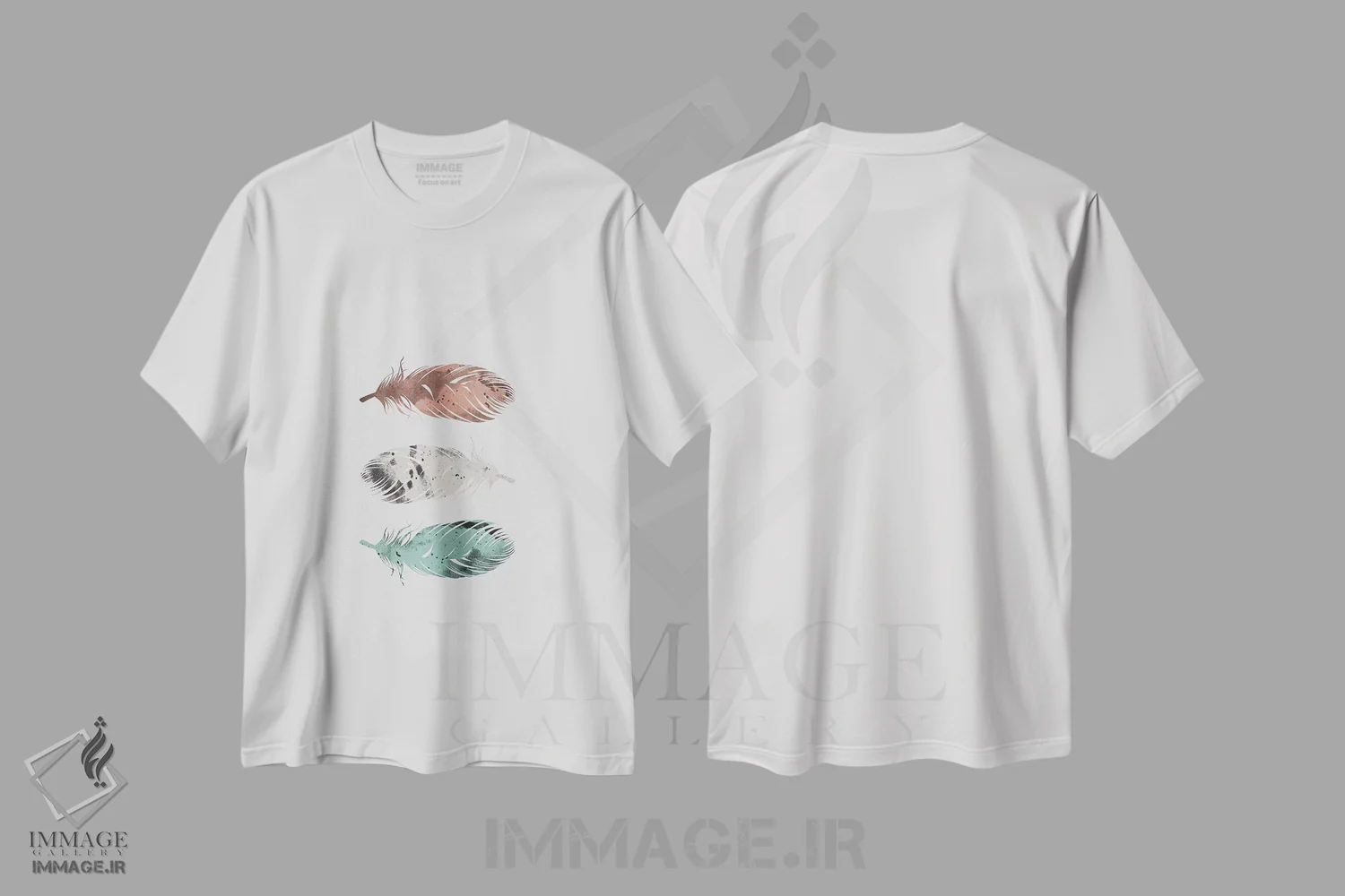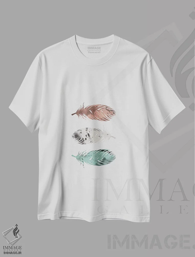 تیشرت سفید طرح دار پرهای پاستلی، تزئینی اثر اورارا استودیو | immage.ir