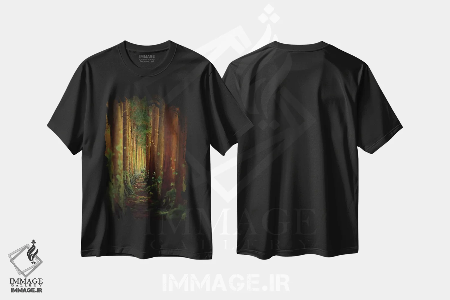 تیشرت مشکی طرح دار جنگل، عکاسی هنری فاخر اثر روی کاریا | فروشگاه ایماژ