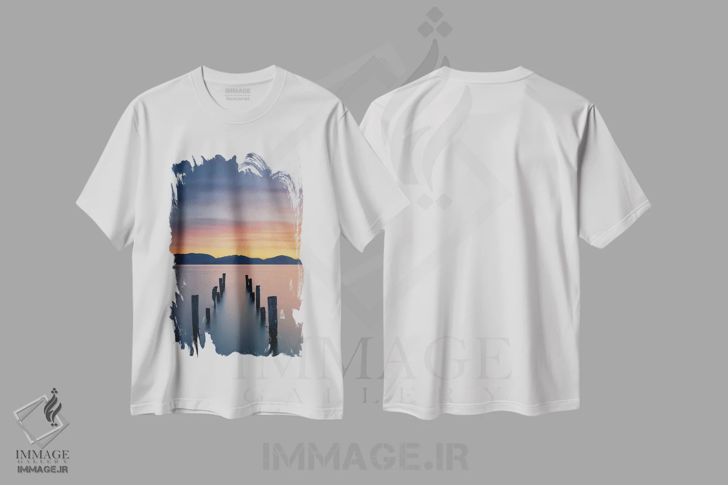 تیشرت سفید طرح دار طلوع آفتاب روی دریاچه، مدیوم اثر سایمون رول | فروشگاه ایماژ