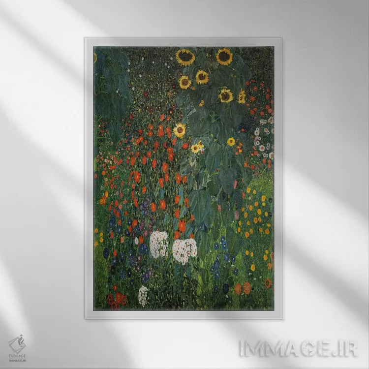 تابلو باغ مزرعه با گل‌های آفتابگردان، ۱۹۱۲ اثر گوستاو کلیمت - نمای قاب‌دار سفید