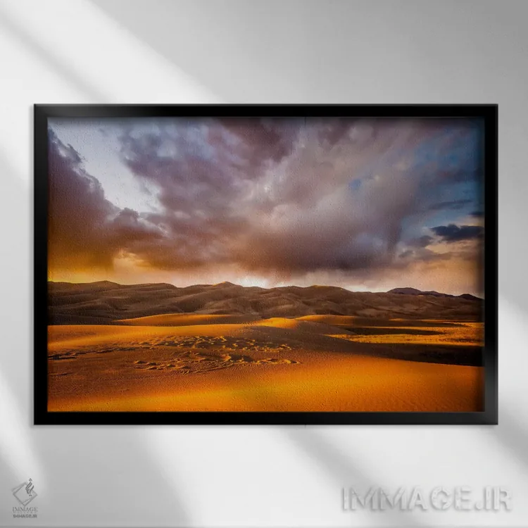 براساس پالت ترکیبی اثر، قاب تیک گرم (چوبی) پیشنهاد اول است و مشکی مات (فریم متوسط) مکمل. برای سفارشهای پروژهای با ابعاد و قابهای اختصاصی با ایماژ در تماس باشید.