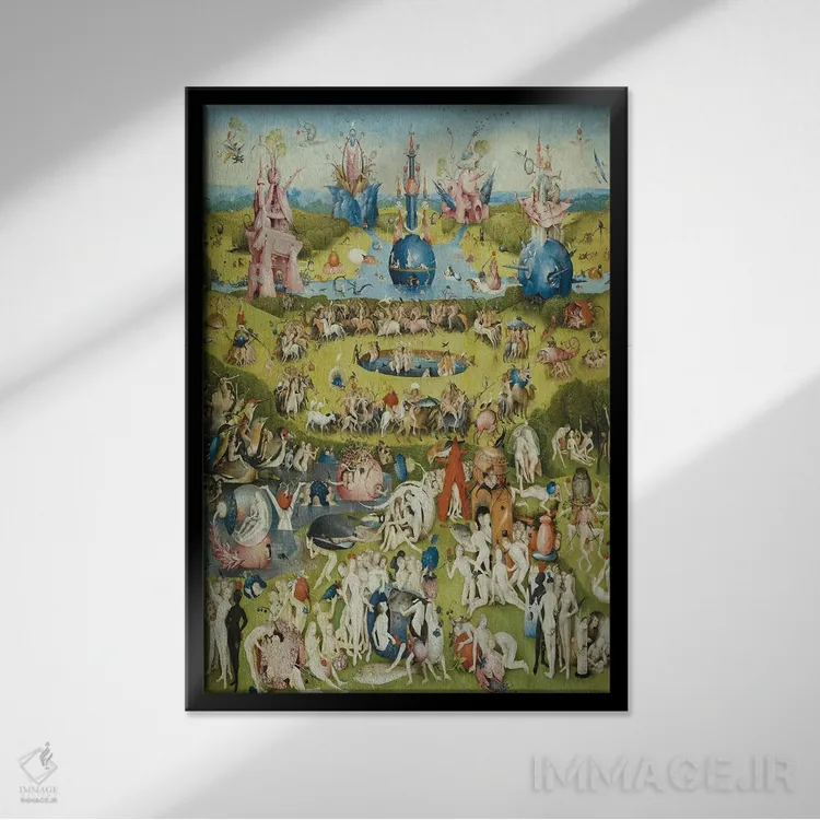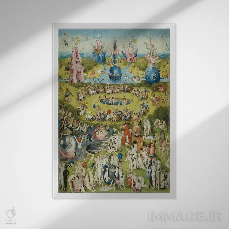 تابلو پنل مرکزی کامل از باغ لذت‌های زمینی اثر هیرونیموس بوش - نمای قاب‌دار سفید