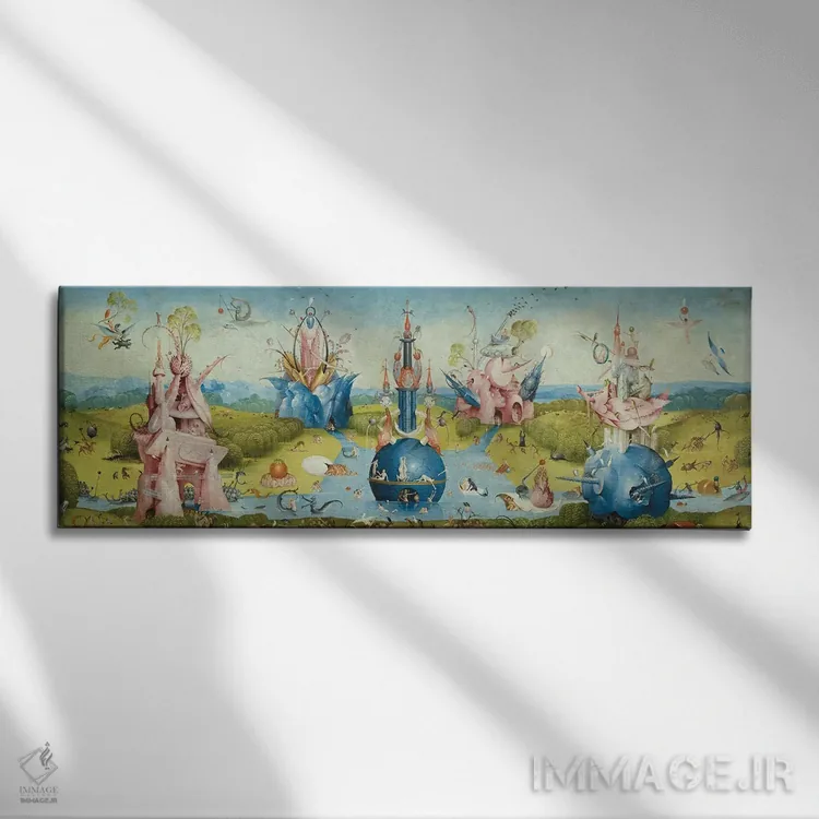 «بالای پنل مرکزی باغ لذتهای زمینی ۲» اثرِ «هیرونیموس بوش» بازیِ دقیقِ خط و هندسه است؛ به دیوار، ریتم معماری اضافه کند؛ برای استودیوهای طراحی انتخابی خوشسلیقه است. با قاب مشکی مات، جلوهٔ تمیزتری پیدا میکند.
