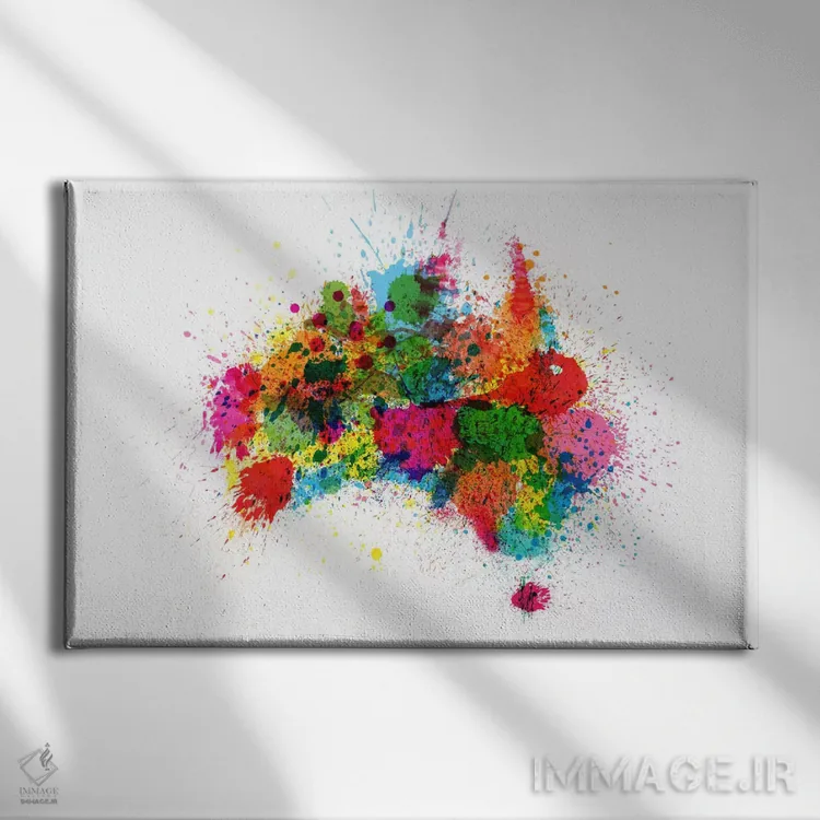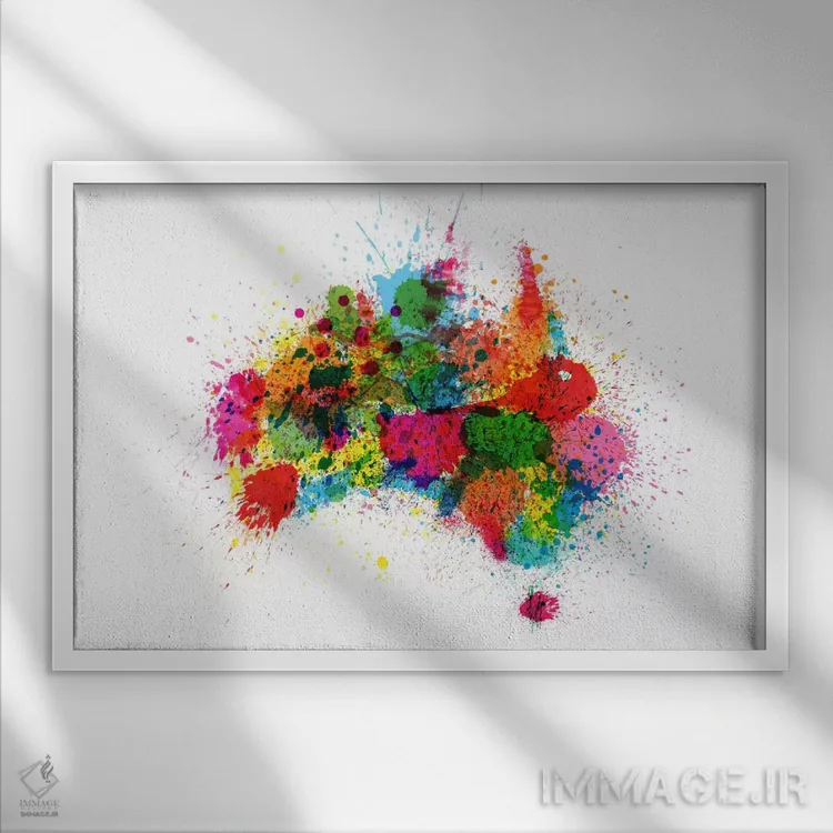 «نقشه استرالیا با پاشش رنگ» اثرِ «مایکل تامپست» بهخاطر فرمهای آزادش، در فضاهای خنثی بهتر دیده میشود و عمق بصری ایجاد میکند.
