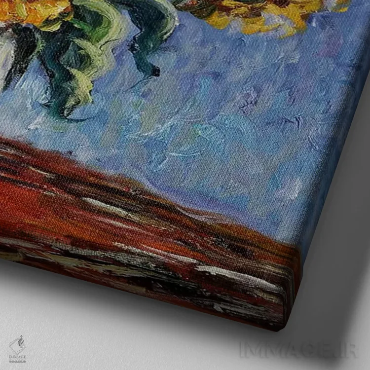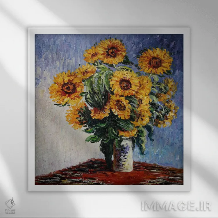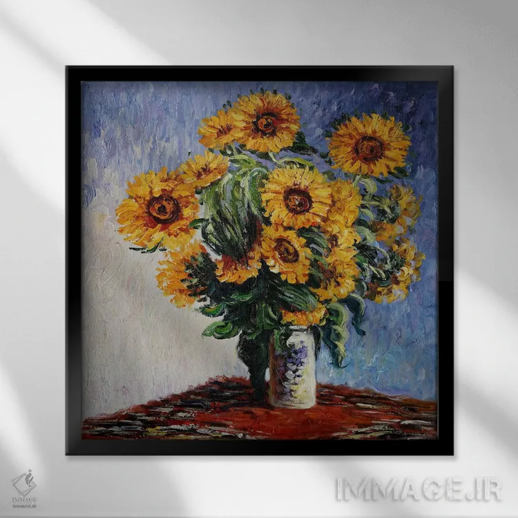 برای اتاق خواب و نشیمنهای آرام، «آفتابگردانها» اثرِ «کلود مونه (نقاش معروف فرانسوی)» تعادل رنگیِ لطیفی به چیدمان میدهد؛ برای فضاهای بوهمی انتخابی خوشسلیقه است. جزئیاتش از نزدیک هم ارزش تماشا دارد.