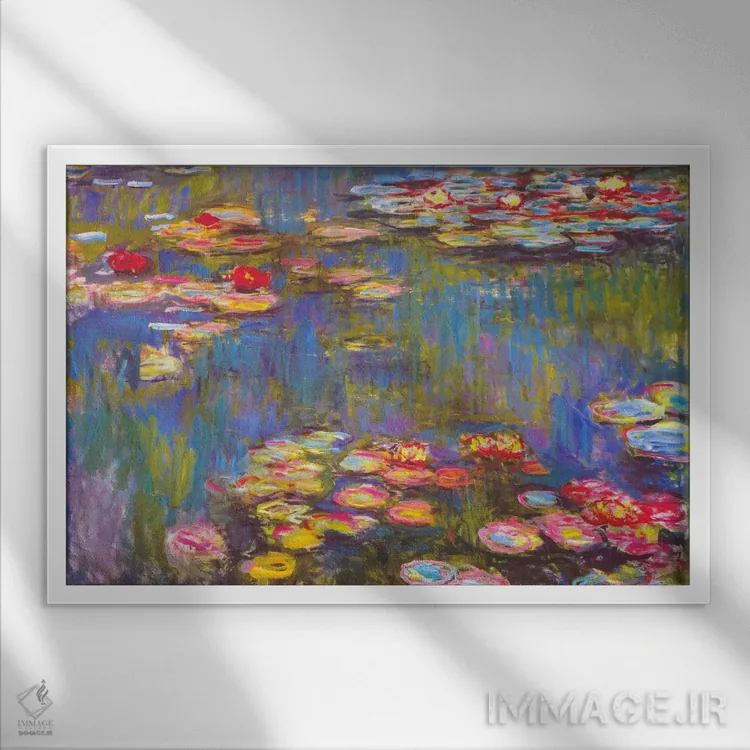 تابلو نیلوفرهای آبی، ۱۹۱۶ اثر کلود مونه (نقاش معروف فرانسوی) - نمای قاب‌دار سفید